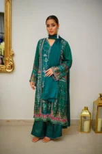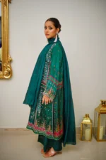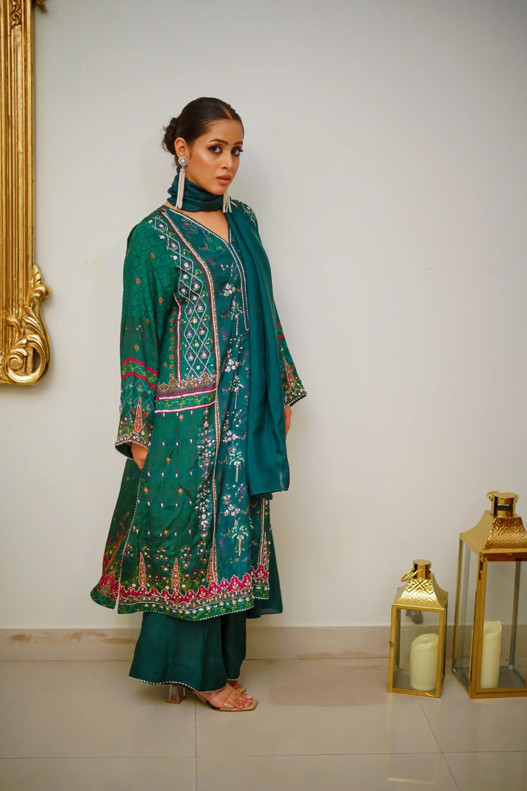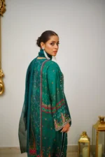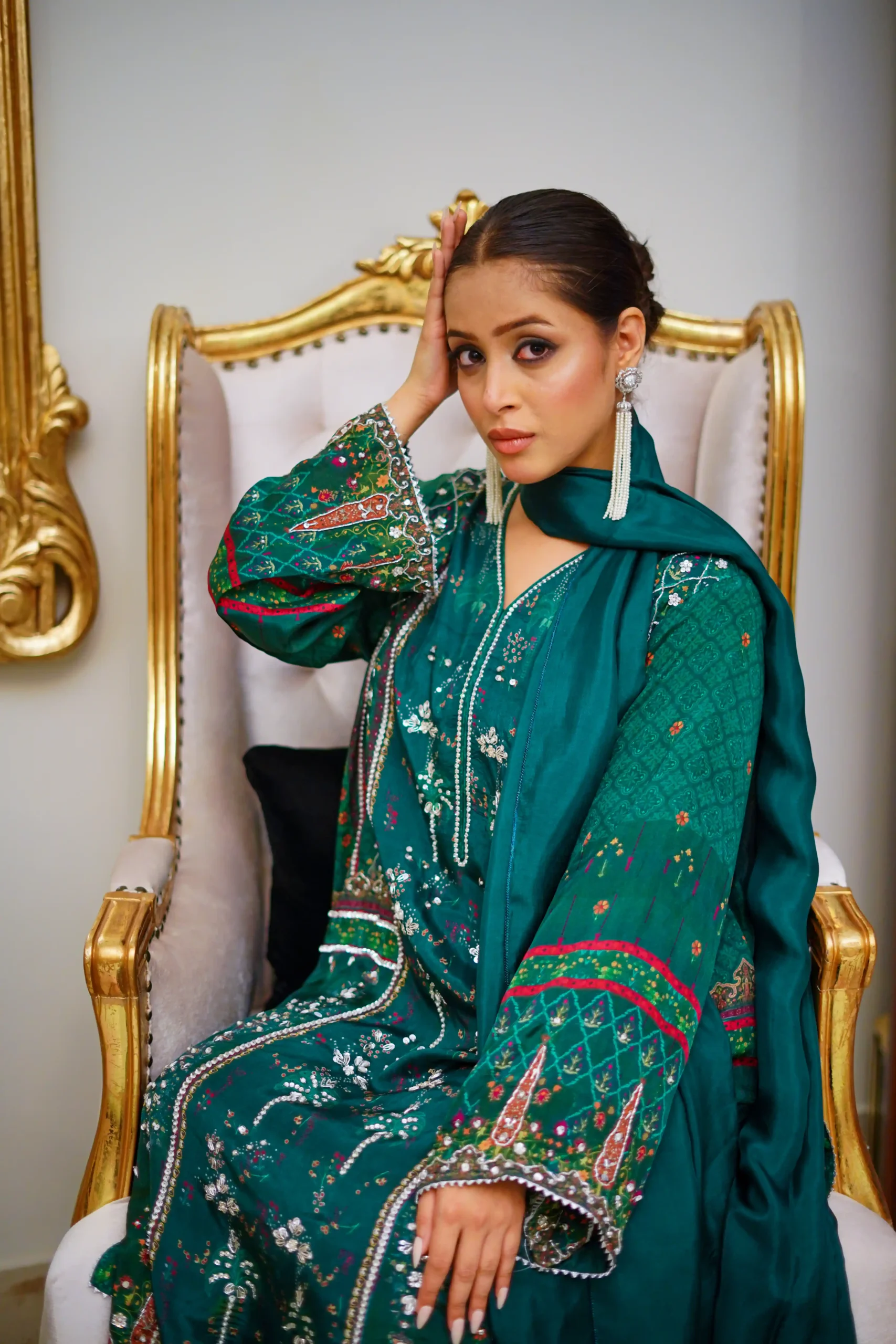 Make a striking impression with our Ayza ensemble in rich emerald green crepe paired with a luxurious silk dupatta. This captivating piece showcases the depth and richness of emerald green, a color that exudes confidence and sophistication. The combination of premium crepe fabric and flowing silk dupatta creates a stunning look perfect for evening events, formal celebrations, and occasions where you want to showcase bold elegance and refined taste.